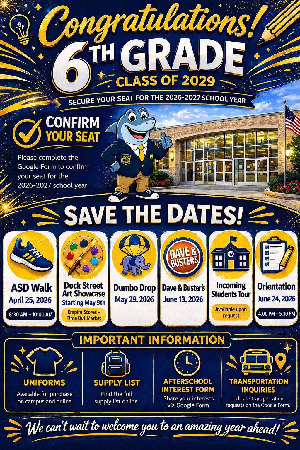 We are very excited to welcome you to Dock Street School for STEAM Studies—Home of the Sharks! Your next three years with us will be filled with growth, opportunity, and unforgettable experiences, and we are confident this will be one of the best journeys yet.